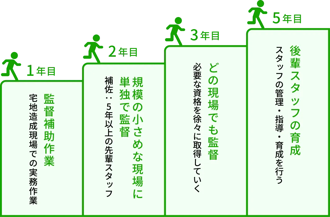 現場のルールを覚えたり、写真を撮ったり、書類整理をしたりと、無理のない範囲からスタートします。徐々に管理業務や専門的な作業へステップアップしていきます。