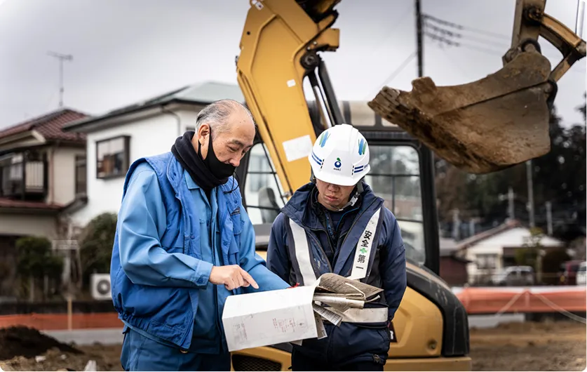 実際に作業する職人さんたちと協力しながら、工事が安全に進むように見守り、段取りを考えます。図面どおりに進んでいるかをチェックするなど、現場全体をサポートする役割です。