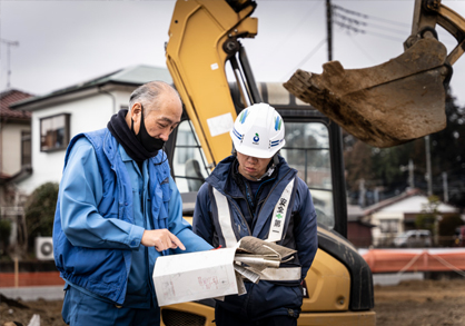 ⼟⽊⼯事(⻘⽊⼟⽊⼯業では住宅や道路、公園の外構整備、地盤造成⼯事など、⼈々の⽣活に近い⼟⽊⼯事を得意としています)の現場監督として、ダイナミックな仕事でありながら、細部に⾄ってはミリ単位の作業精度、提出する書類などの正確性の⾼さが常に求められる職種です。規模の⼤⼩を問わず暮らしに密着したインフラの整備や防災に繋がる護岸⼯事など、当たり前に求められる安全・安⼼・利便性を提供する社会貢献度の⾼さが魅⼒の仕事です。